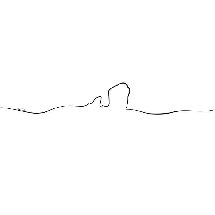Cuadro en blanco y negro en el que, por medio de una sutil y delicada línea, se representa el skyline de uno de los emblemas naturales de la isla de Gran Canaria, el Roque Nublo.