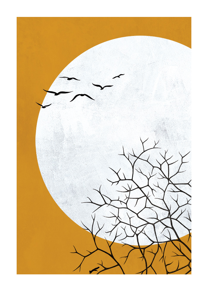 Cuadro en el que se retrata una «aulaga» y unas «gaviotas» recortándose sobre un círculo blanco que simula la luna. En la parte baja de la imagen aparece también una ardilla a modo de guiño a la isla de Fuerteventura.