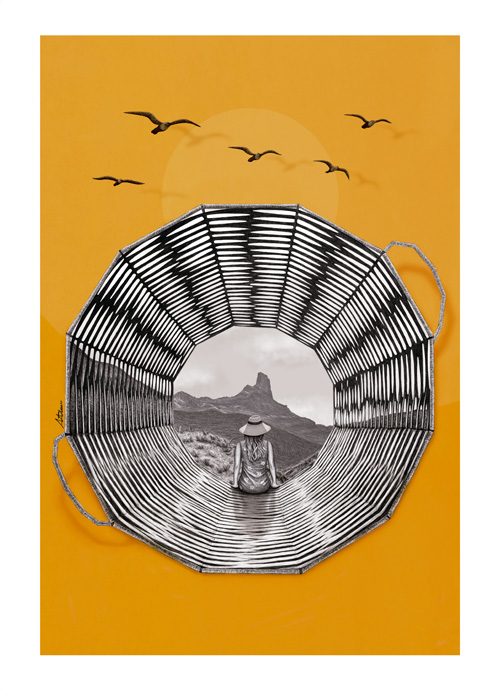 Ilustración en la que aparece reflejada una de las imágenes más icónicas del municipio de Tejeda, en Gran Canaria: La Cesta. En este cuadro se retrata el monumento del mismo nombre, a través del cual una mujer contempla el paisaje en el que resalta la figura del roque Bentayga.