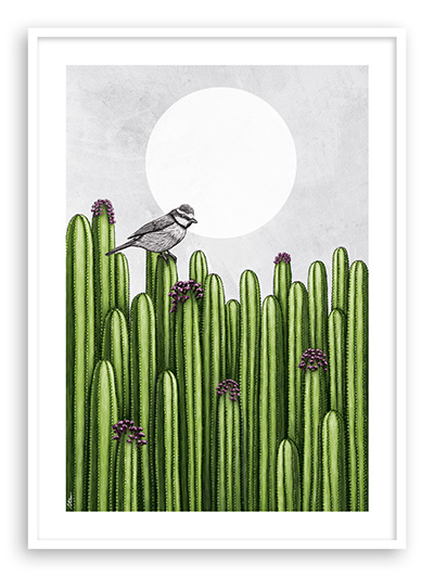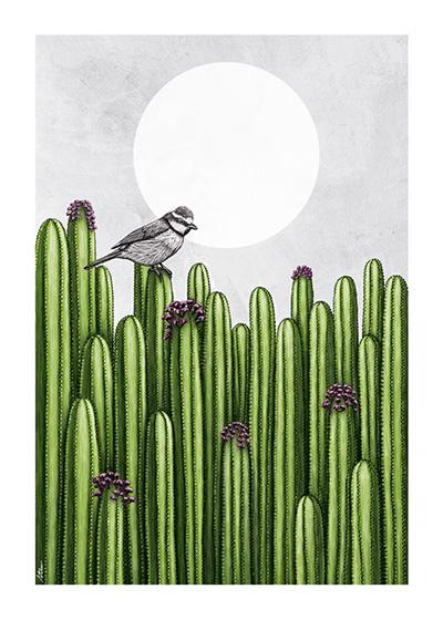 Cuadro en el que se representa un «Herrerillo Canario» (Cyanistes teneriffae) en blanco y negro sobre un cardón, que resalta por su atractiva tonalidad.
