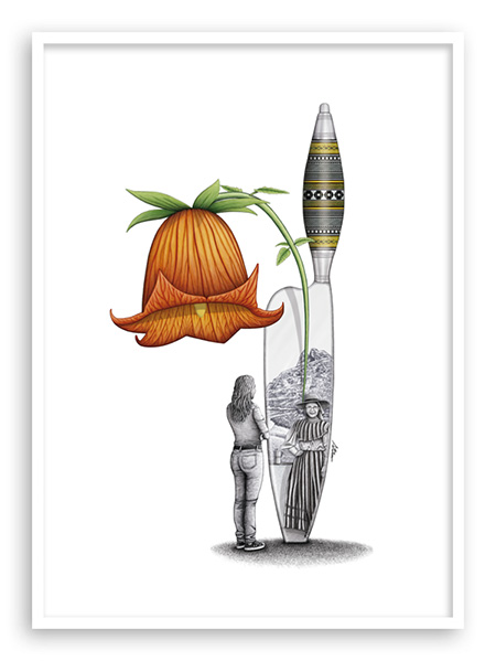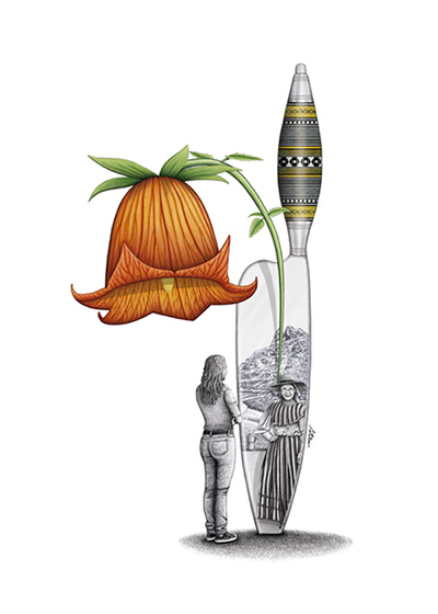 Cuadro en el que dos mujeres se reflejan en la hoja de un cuchillo canario, del que sale una flor de «Bicácaro».