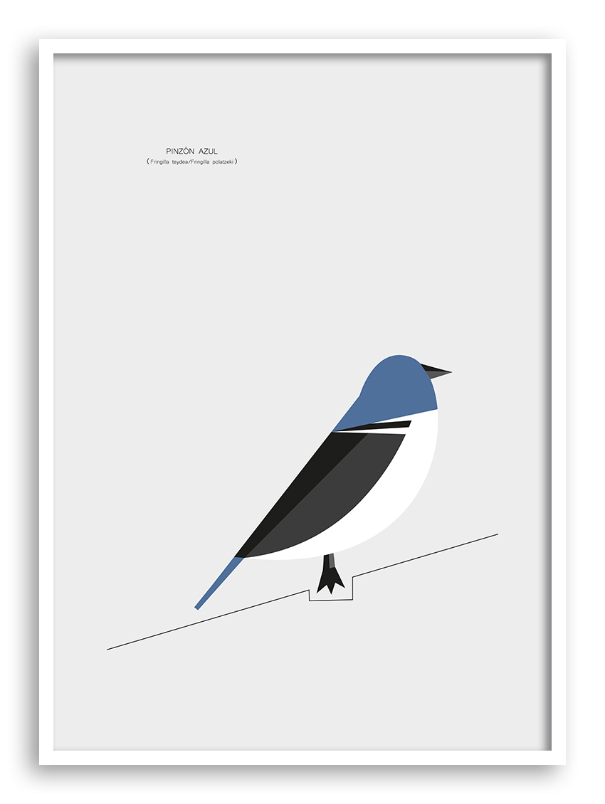 Lámina de diseño gráfico que retrata al ave «Pinzón azul», cuya especie cuenta en Canarias con dos endemismos: teydea y polatzeki.