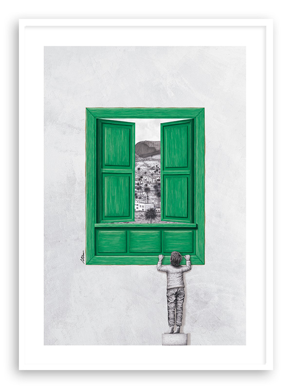 Lámina en la que se retrata una ventana tradicional canaria de color verde y un niño intentado mirar a través de ella. En el interior se representa una imagen del pueblo de Haría, en Lanzarote.