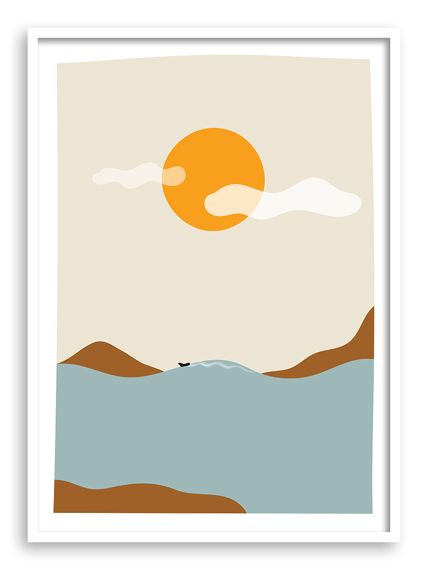 Atractivo póster en el que aparece representado un barco navegando bajo un enorme sol anaranjado. Este cuadro posee unos tonos cremosos que le confieren una elegancia muy particular.
